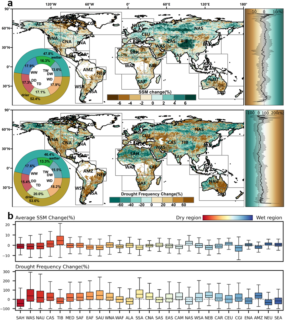 更为重要的是,该研究对国际上广泛采用的“干者愈干、湿者愈湿”范式提出了新的观测证据。研究发现,真正严格符合这一范式的区域仅约占全球陆地面积的三分之一,而相当比例区域呈现相反或更为复杂的变化格局,说明未来全球土壤湿度演变并非单一线性增强过程,而是受蒸散发、降水变率及区域陆气耦合共同调控,具有显著的区域差异性和非线性特征。