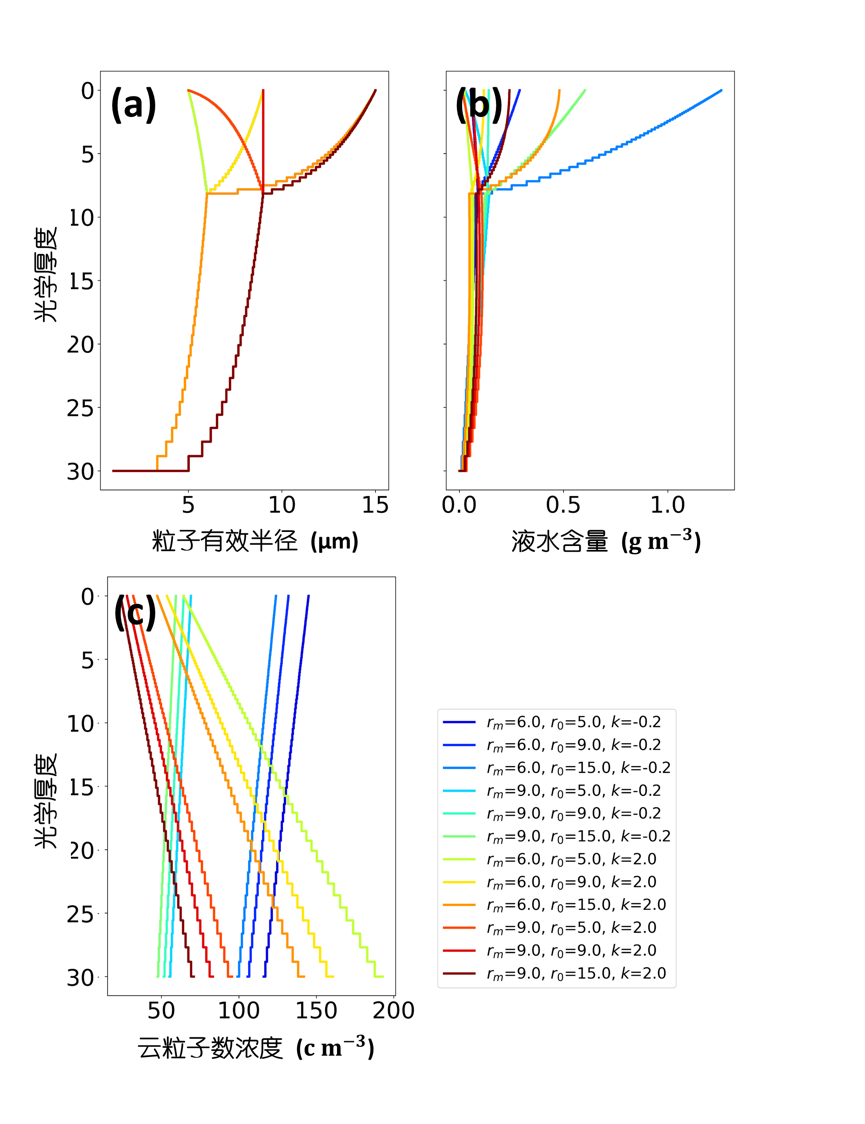 图1 基于云廓线重建模型(CPRM)生成的水云微物理廓线。CPRM的参数包括:云底粒子有效半径 (
