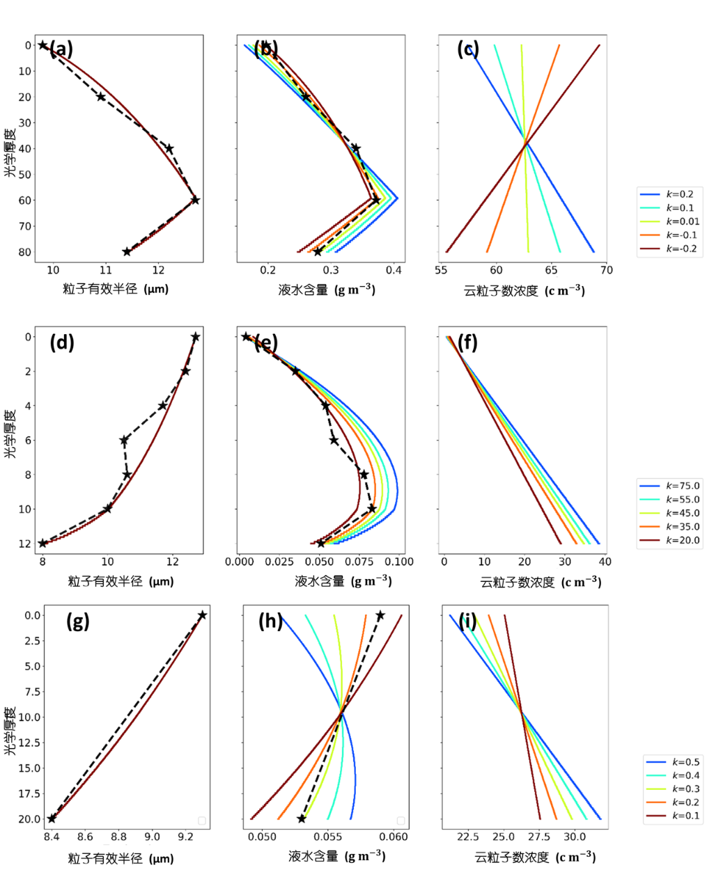 为2.0km,k在0.1~0.5之间变化,图中黑色星号代表CloudSat观测, 彩色线为CPRM的结果。
