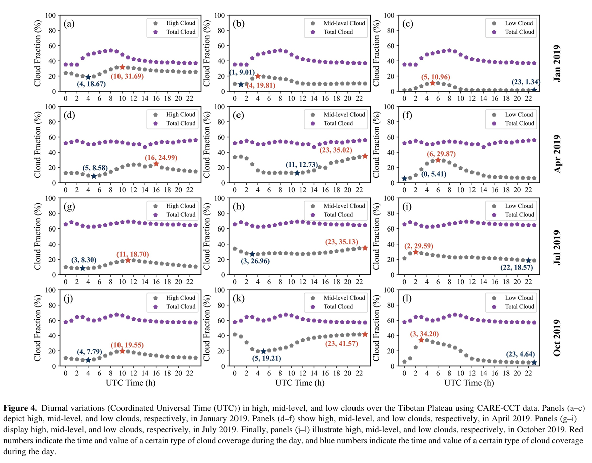 为了构建长期、连续的气候数据记录,研究团队将这一新算法成功应用于CERES卫星数据集,生成了2001至2023年共23年的青藏高原地区月均云量产品。该产品细致区分了高云、中云和低云量,揭示了高原不同云类型所呈现的日变化规律和显著季节性特征。这套长期云分类数据集,目前已在CARE产品主页(https://www.slrss.cn/care/)及在我国青藏高原科学数据中心(https://data.tpdc.ac.cn/zh-hans/data/03efb54f-e666-4869-a940-9ed9acd1cd3c)公开发布,供全球相关领域的科研人员免费下载使用。
