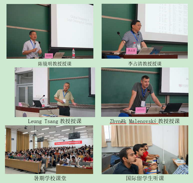 暑期学校邀请到多伦多大学地理与规划系教授、南京大学国际地球系统科学研究所所长、加拿大高级首席科学家、加拿大皇家科学院院士陈镜明教授和美国马里兰大学大气海洋系终身教授李占清教授分别做题为“植被生产力遥感的历史演变:从FPAR,LAI,CI,LCC到Vcmax”和“New Approaches in Estimating Surface Air Pollution Indices by Remote Sensing and Understanding Aerosol-PBL Interactions”的特邀报告。整个暑期学校通过专题授课的方式,为学员系统的介绍了定量遥感研究和应用中的原理、方法和技术,内容生动充实,使学生更清楚的了解相关领域最新的研究进展。在英文课程中,暑期学校邀请到该领域Leung Tsang、Jiancheng Shi、Adriano Camps等国际知名专家进行授课,国际和国内学生踊跃提问,课堂气氛热烈。