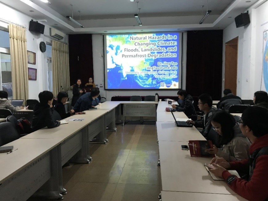 2018年10月17日上午,应蒋玲梅副教授邀请,美国马里兰大学帕克分校(University of Maryland, College Park)陶静博士来遥感科学国家重点实验室开展学术交流,并作了题为“Natural Hazards in a Changing Climate: Floods, Landslides, and Permafrost Degradation”的学术报告。