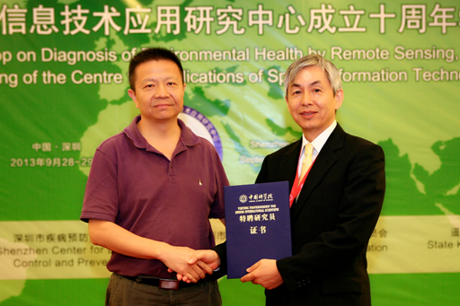公共卫生领域空间信息技术应用研究中心执行主任曹务春研究员和曹春香研究员分别担任本届会议主席,美国波士顿大学Ranga B. Myneni教授、日本东京大学Haruo Sawada教授和美国查普曼大学Ramesh P. Singh教授等分别担任本届会议副主席。在开幕式上,深圳市疾病预防控制中心程锦泉主任作了领导讲话并介绍了与会嘉宾,之后曹春香研究员对公共卫生领域空间信息技术应用研究中心十年建设和大会发展历程进行了回顾,并介绍了大会主题和会议议程。此外,为了感谢Haruo Sawada教授对环境健康遥感诊断新学科方向的大力支持以及以期进一步更紧密的合作,大会上由中国科学院遥感地球所赵忠明书记为Haruo Sawada教授颁发了特聘研究员证书。