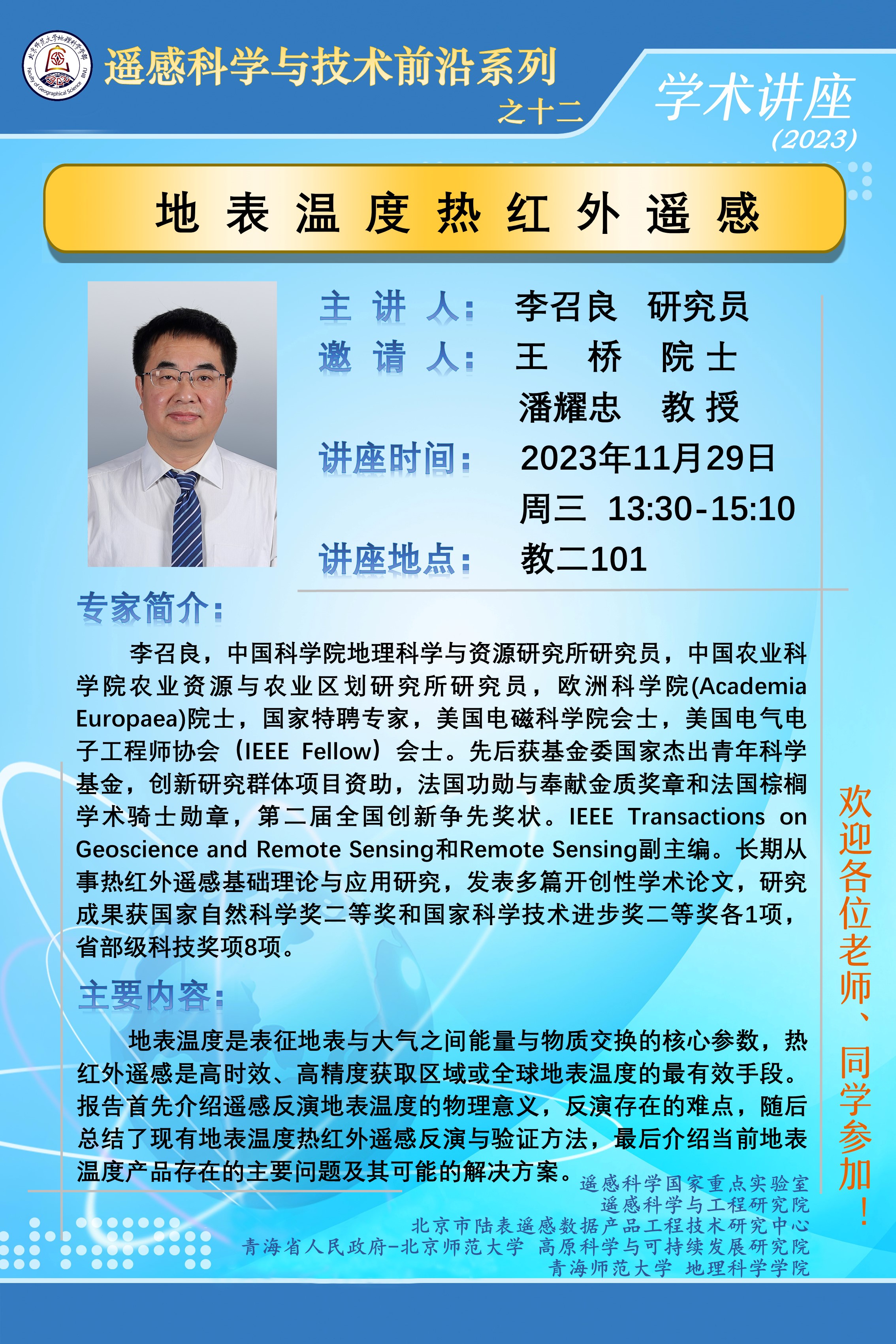 李召良,中国科学院地理科学与资源研究所研究员,中国农业科学院农业资源与农业区划研究所研究员,欧洲科学院(Academia Europaea)院士,国家特聘专家,美国电磁科学院会士,美国电气电子工程师协会(IEEE Fellow)会士。先后获基金委国家杰出青年科学基金,创新研究群体项目资助,法国功勋与奉献金质奖章和法国棕榈学术骑士勋章,第二届全国创新争先奖状。IEEE Transactions on Geoscience and Remote Sensing和Remote Sensing副主编。长期从事热红外遥感基础理论与应用研究,发表多篇开创性学术论文,研究成果获国家自然科学奖二等奖和国家科学技术进步奖二等奖各1项,省部级科技奖项8项。