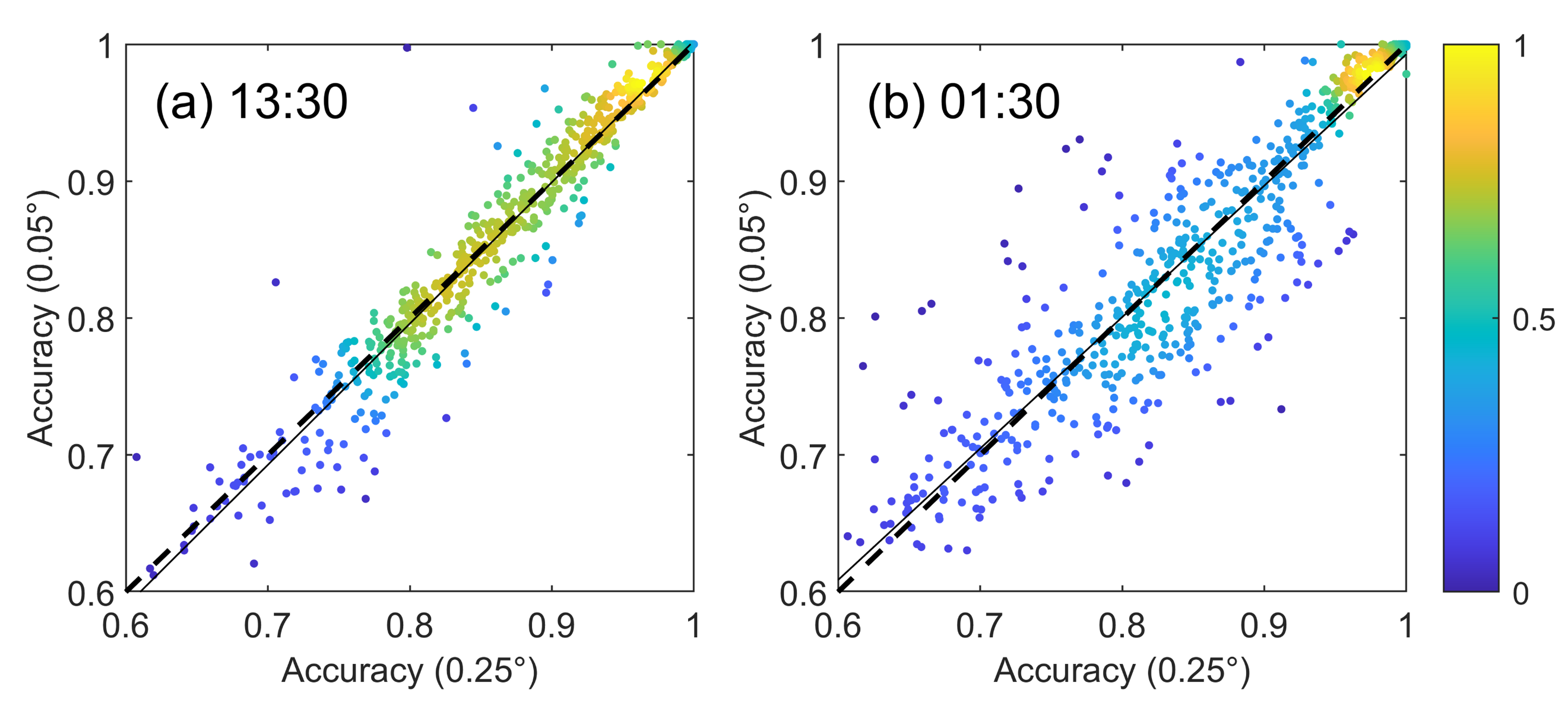 图2. 0.05°降尺度冻融产品FT-HiDFA与0.25°原始冻融产品之间的精度对比(a) 和 (b) 分别展示了不同当地时(13:30 和 01:30)的产品精度