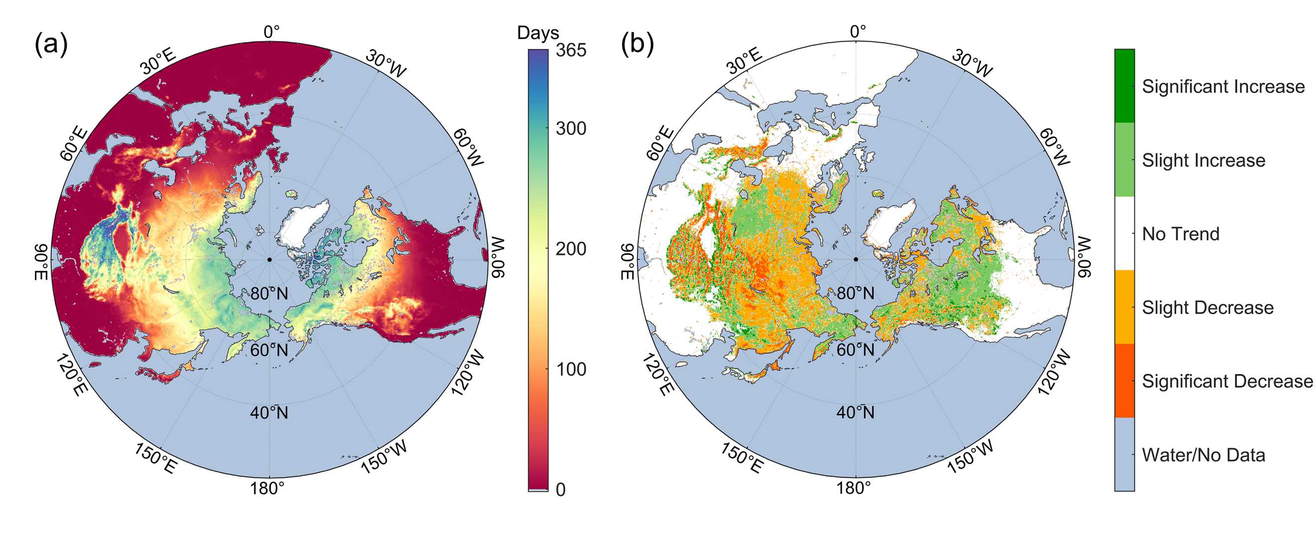 图3. 2003-2023年当地时01:30北半球冻结天数空间分布与变化趋势(a) 年平均冻结天数分布;(b) 冻结天数变化趋势。