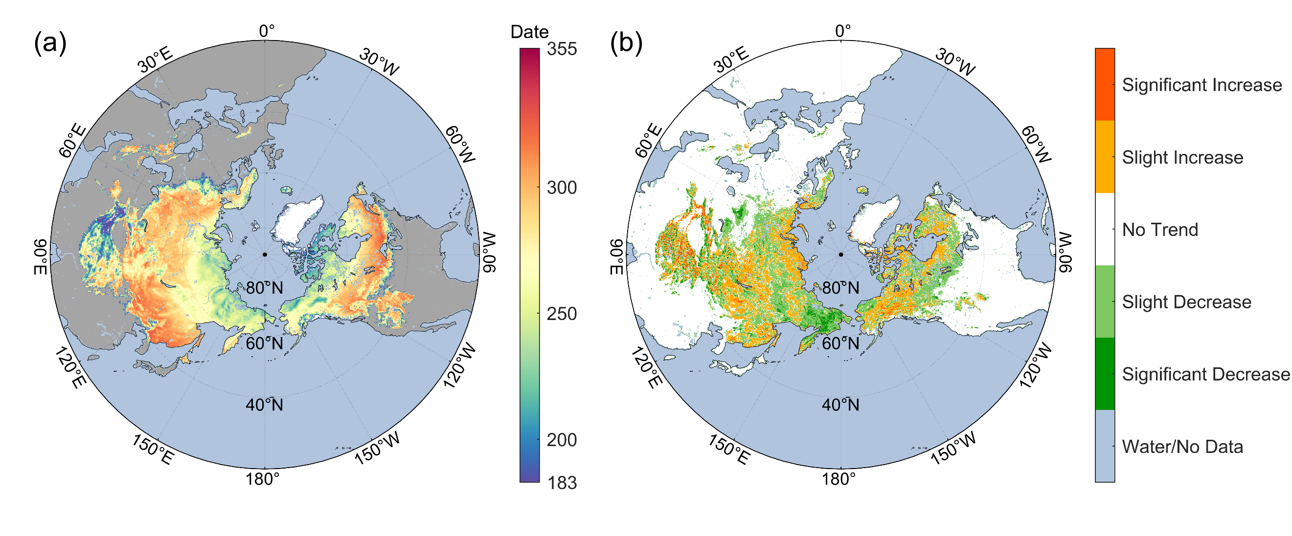 图4. 2003-2023年当地时01:30北半球冻结起始日空间分布与变化趋势(a) 年平均冻结起始日分布;(b) 冻结起始日变化趋势。