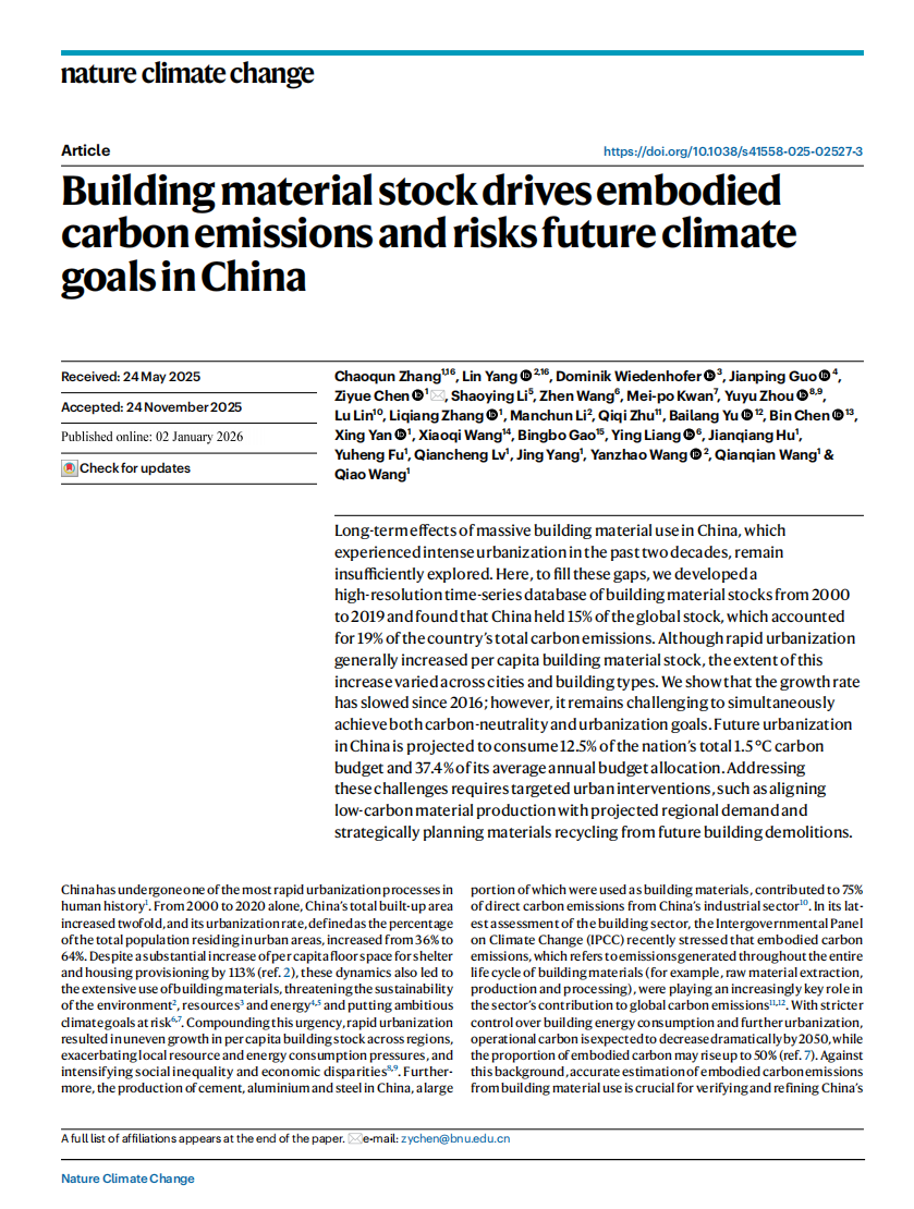 1月2日,遥感与数字地球全国重点实验室陈子悦教授团队在Nature Climate Change发表题为“Building material stock drives embodied carbon emissions and risks future climate goals in China”的研究论文。