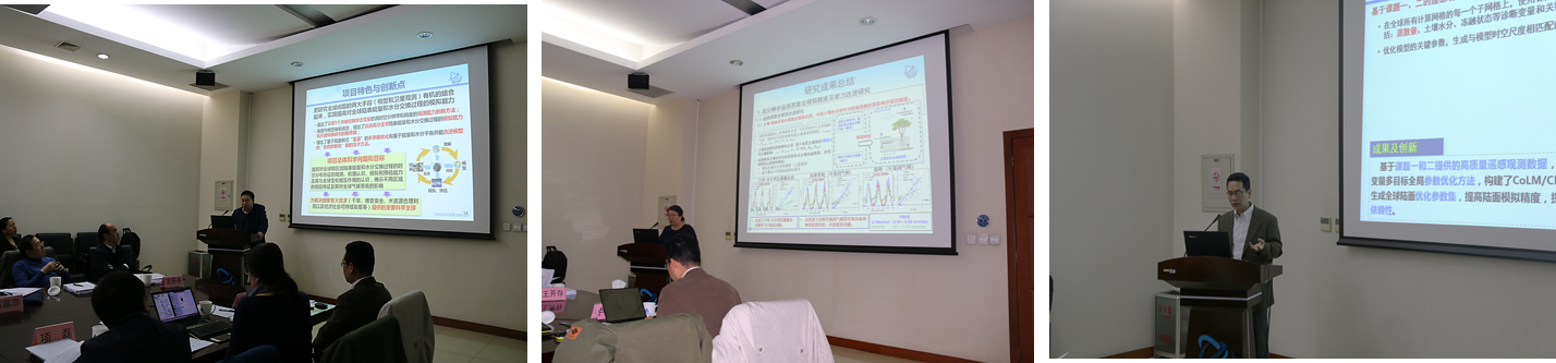 会上,项目首席施建成研究员从项目背景、研究目标及思路、项目研究执行情况等方面向参会领导和验收专家进行了项目汇报,随后项目的三个课题分别在研究任务完成情况、对项目总体贡献、主要研究进展和结论、成果创新性、人才培养及交流情况等方面分别做了详细汇报。项目开发了陆表能量和水分交换过程5大关键控制状态变量(土壤水分、积雪、冻融状态、动态水体和辐射等)新型遥感方法,大幅度提升了遥感反演精度和分辨率,为全球能量、水分循环提供了关键数据集和科学参考;实现了高分辨率遥感蒸散发估算模型的改进,包括土壤水分运移模拟、冰雪升华及冠层截留蒸发的参数化方案,分别基于地表观测与高分辨率地表蒸散模型研究了地表蒸散发的尺度效应并发展了尺度转换方法,获取了典型区域像元、区域尺度地表蒸散发相对真值及全球陆面粗分辨率地表蒸散发验证数据集;研发了基于遥感观测的陆面模式“面源”参数优化方法,增强了陆面模式对地球表层系统时空异质性的表达能力,有效提高了陆面模式的模拟能力和模拟精度,同时,将优化后的陆面模式耦合于地球系统模式CIESM中,改进了地表温度和降水的模拟精度,更好的重现了全球变化下的全球增温以及我国西北区域变暖变湿的趋势,最后,利用CIESM根据不同的SSP和RCP情境,对未来(2015-2100年)气候进行了预估,揭示了不同全球变化情境下陆表水分和能量循环过程的分布规律和变化趋势。