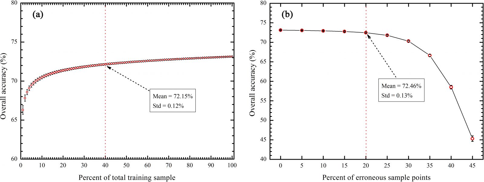 该研究提出“少量全球样本稳定地表覆盖分类”理论。该理论指出了全球训练样本迁移到其他年份或不同传感器获取的遥感数据对最少样本数量和误差限度的要求。为了证明该理论在全球尺度的正确性,研究团队设计了一系列严密的随机试验,分别测试了分类器对样本数量的敏感性,以及对因每年地表实际发生的土地覆盖变化或解译误差导致的样本错误的容忍度。结果显示,在纳入实验的样本量仅占整体的40%,或训练样本的误差比例达到20%时,分类精度的损失在1%之内,说明稳定分类仍能得以实现,即 “少量全球样本稳定地表覆盖分类”的理论是成立的。这一理论保证了对样本进行迁移的有效性。
