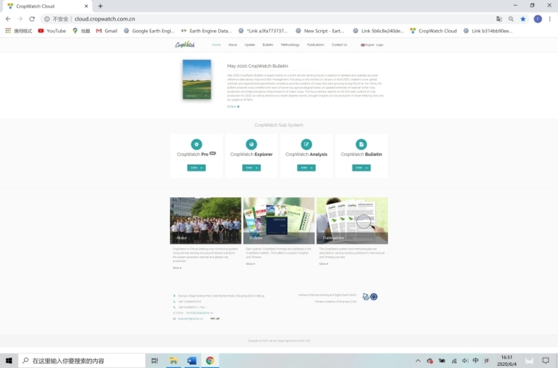 全球农情监测云平台(CropWatch)简介:自1998年“中国农情遥感速报”(CropWatch)建成以来,CropWatch持续为全国乃至全球的公众提供农情信息服务22年。2013年以来,CropWatch发展构建了全新的多尺度、多时空分辨率、多指标相结合的多层次全球农情定量监测技术与指标体系,实现从全球到田间的多尺度无缝监测。基于阿里云研发的参与式全球农情遥感监测云平台(CropWatch-Cloud)(平台主页:http://cloud.cropwatch.com.cn),为不同的农情信息需求者提供不同的农情信息服务,包含全球农情遥感监测计算(CropWatch Pro)、全球农情遥感监测信息在线浏览(CropWatch Explorer)、全球农情遥感速报在线分析(CropWatch Analysis)与在线发布(CropWatch Bulletin)在内的四大模块,实现监测模型处理云端化、数据信息透明化、分析参与开放化以及监测成果公开化的链式无缝集成。