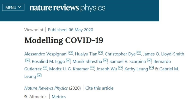 就新冠肺炎疫情的研究成果,田怀玉团队还受邀在Nature Reviews Physics杂志上发表观点文章(Modelling COVID-19)。文章就传染病模型揭示疾病传播规律、当前的状况以及仍需要做什么工作发表了重要看法。北京师范大学全球院、遥感科学国家重点实验室为共同通讯单位。