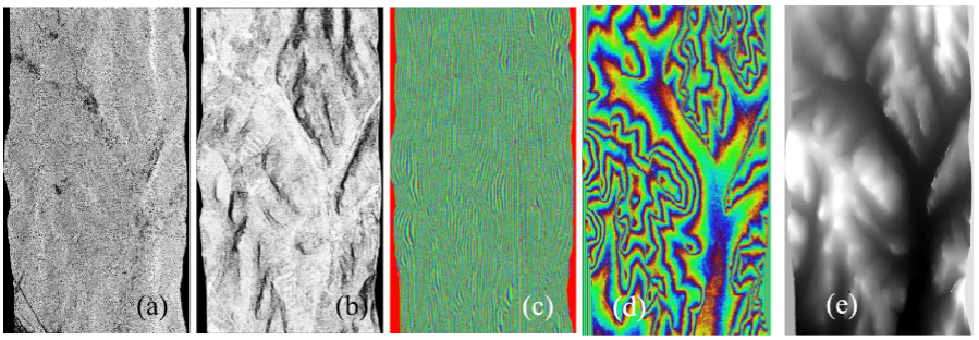 (a) 雷达后向散射图像;(b)雷达干涉相干系数图;(c)雷达干涉纹图;(d)雷达干涉地形相位;(e)解缠后的地形相位