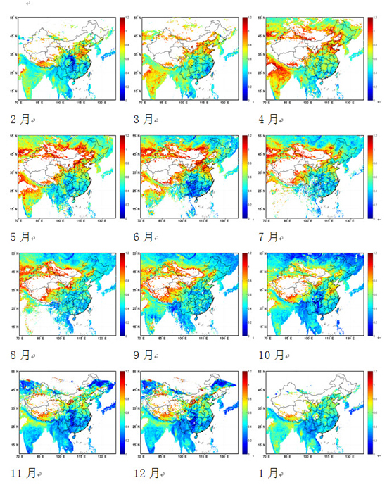 图3 基于AVHRR传感器的中国地区气溶胶光学厚度月变化图(2009年)