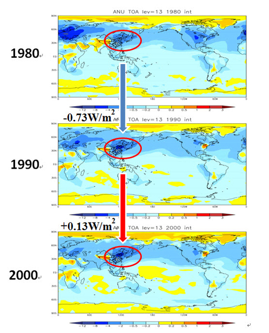 在综合利用地基、卫星以及模式模拟我国气溶胶直接辐射强迫方面,华东地区气溶胶光学特性系统观测揭示了烟尘和沙尘对该地区的显著影响;星地联合观测揭示南亚输送对青藏高原气溶胶的显著影响;卫星观测给出东亚地区细粒子AOD时空分布,结果显示东亚地区高气溶胶区与人口密集以及经济发展地区相联系。利用区域化学气候耦合模式给出我国PM10时空分布,并对2010年春季特大沙尘暴事件进行了模拟评估;分析了东亚地区多成分气溶胶(硫酸盐、黑碳、有机碳、沙尘、海盐)直接辐射强迫季节变化及气溶胶光学厚度的时空分布;基于IPCC AR5排放清单,对全球及我国历史长期气溶胶直接辐射强迫进行了模拟。