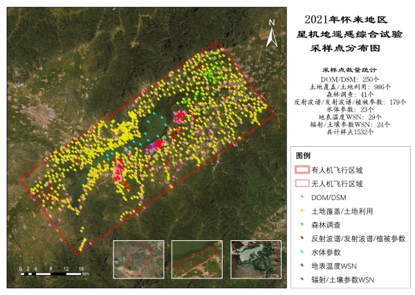 其中有人机搭载多光谱、高光谱、激光雷达、中红外和热红外载荷,飞行区域为覆盖官厅水库900平方公里区域。无人机搭载多光谱、高光谱和激光雷达,覆盖河北怀来遥感综合试验站、野鸭湖湿地公园和天漠地区周边各4平方公里重点区域。地基观测设立了几何组、土地利用土地覆盖组、森林样地组、地物波谱组、地表发射率/温度组、植被参数组、水体参数组和无线传感器网络自动观测组共8个观测组,历时两个多月,开展了几何、地表类型、辐射基础参量、辐射平衡参量、植被参量和水参量等32种关键参量长时间观测,覆盖1532个样点。