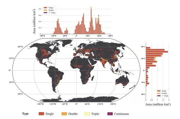 耕地作为提供人类赖以生存和发展所需食物的基础,其可持续利用对于实现零饥饿目标具有重要作用。复种指数是描述在同一块农田中一年内接连种植几季作物的指标,是衡量耕地资源集约化利用程度的重要指标,其准确监测有助于掌握全球粮食安全状况。然而,因不同地区耕地破碎程度差异显著、利用模式多样以及受云雨影响,高精度的全球复种指数提取面临巨大挑战。现有复种指数数据产品分辨率较低、不确定性高,难以准确刻画高度异质和破碎化地区的真实情况。