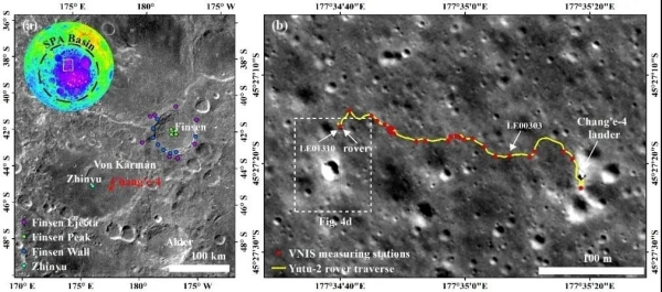 图1. (a)“ 嫦娥四号”着陆区地质背景图;(b)“ 玉兔二号”前13月昼巡视路线图