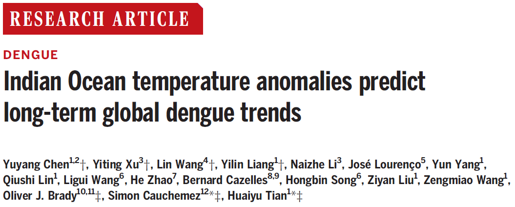 近日,遥感科学国家重点实验室北京师范大学田怀玉教授团队联合法国巴斯德研究所Simon Cauchemez研究员在《Science》以长文形式(Research Article)在线发表了印度洋温度异常预测全球登革热长期趋势的研究论文。