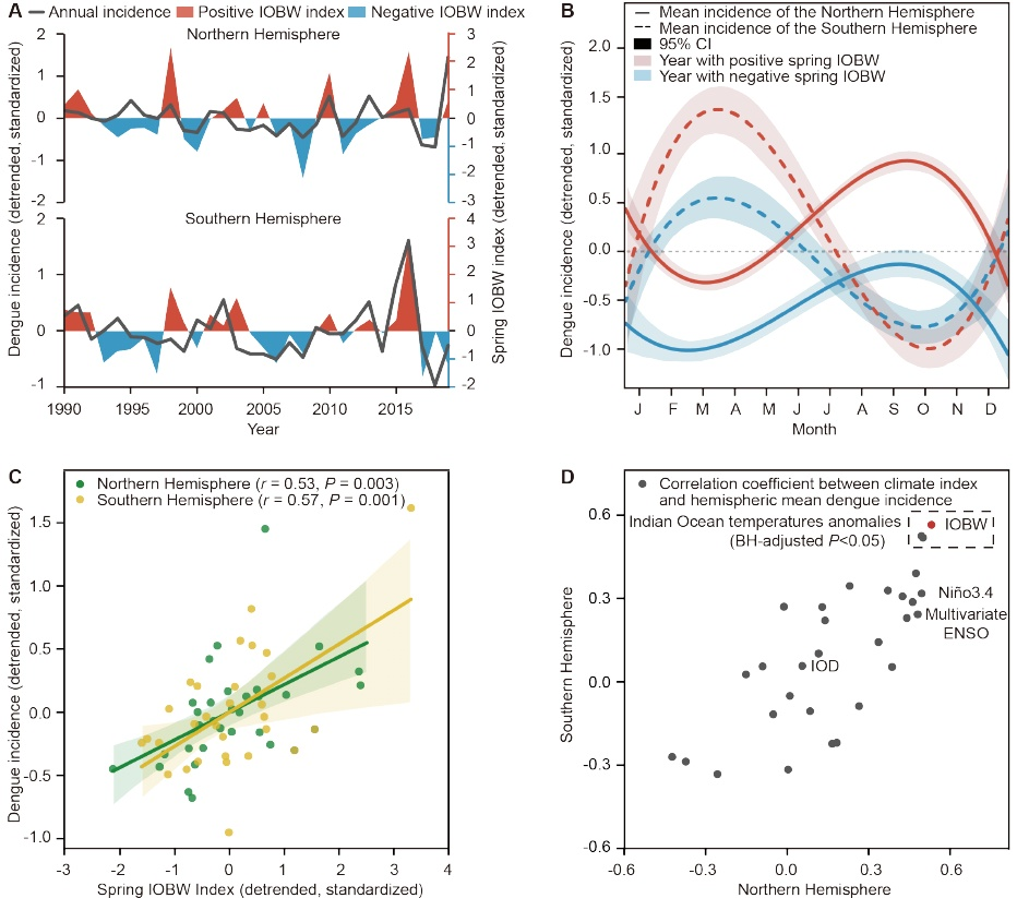 IOBW指数可作为预测全球登革热流行年际和季节规模的指标。IOBW指数是热带印度洋海表温度(SST)异常的区域平均值,以全海域变暖或变冷为特征,是热带印度洋变率的最主要模态。研究团队发现过去30年间(1990-2019)南、北半球的登革热发病率和IOBW指数表现出一致的长期趋势(图1A)。同时,登革热流行季前一季度气候指数与南、北半球登革热月发病率均相关,具体表现为:当IOBW指数为正(负)值时,登革热月发病率偏高(低)(图1B)。团队还进一步测试结果的特异性,发现在30个全球气候指数中,IOBW指数与南、北半球登革热年发病率呈现最密切的相关性,且南、北半球的关联性基本一致(图1C、图1D)。上述发现表明,登革热规律性的年际和季节波动可能受到全球气候模态之一的热带印度洋全区海温一致变化模态的统一影响。