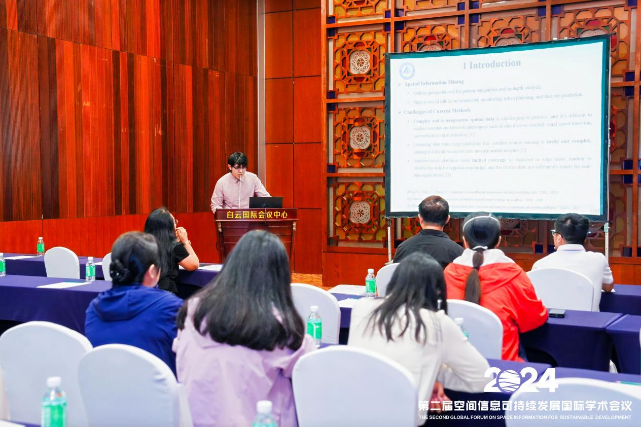 国重室张宇同学在会议上做了《基于地基康遥仪的时空分析方法研究》的学术报告(图3)。他的研究结合物联网、边缘计算、深度学习等关键技术研发,通过分析拉萨、岱海、北京等多海拔地区的测试数据内涵诠释了“地基多参数智能环境健康遥感诊断仪”(简称“地基康遥仪”)的核心内容,其核心算法将为空间信息挖掘多源异构数据的分析处理及时间、空间尺度问题解决提供了一种高效便捷的解决思路。该论文获评第二届空间信息全球可持续发展国际学术会议优秀论文奖。