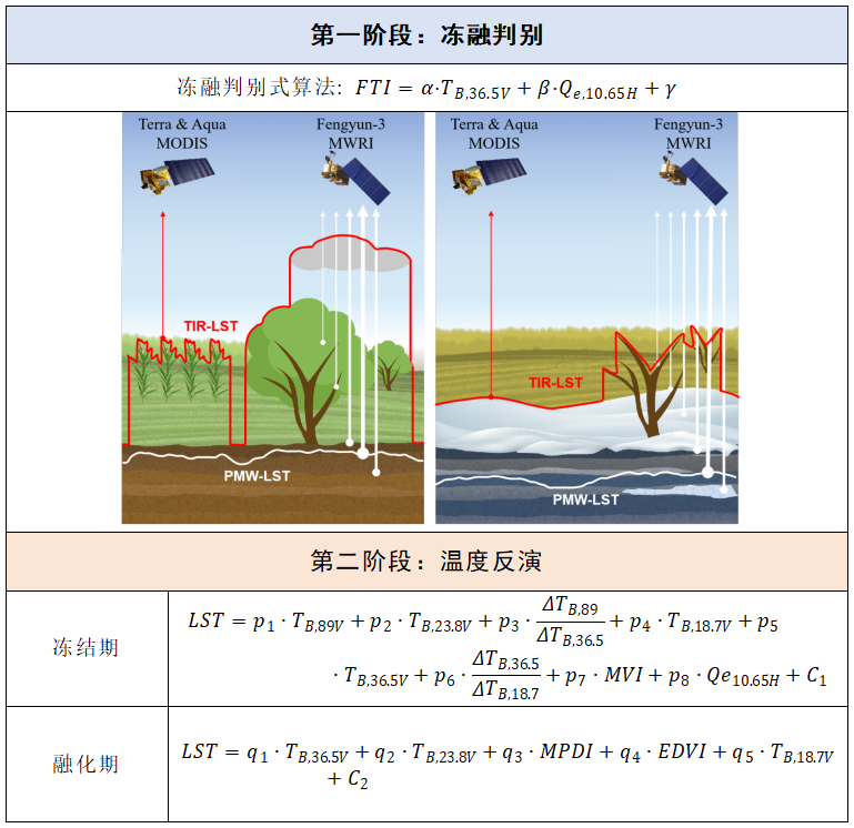 第一阶段,基于微波多通道亮温数据构建冻融指数(FTI),量化冻融相变过程中温度与介电特性的协同变化特征,采用冻融判别式算法实时判断地表冻融状态,并针对不同状态构建独立的温度反演模型。