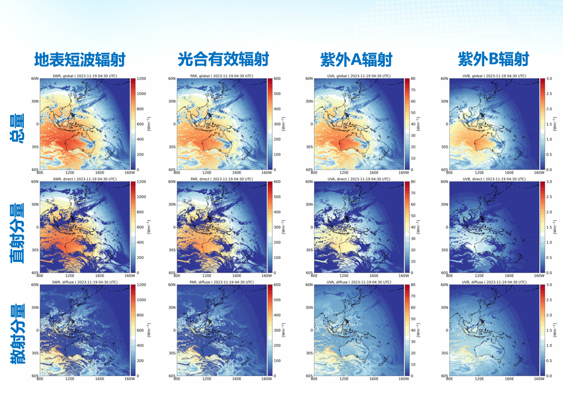 CARE近实时遥感监测系统可以提供12种地表太阳辐射数据产品,包括太阳短波辐射、光合有效辐射、紫外线A辐射、紫外线B辐射以及每个辐射组分的总辐射、直射及散射分量。相比国际同类卫星遥感产品或再分析资料,该产品在时空分辨率及精度方面均取得显著提升,特别是在监测冰雪覆盖区和云下太阳辐射快速变化区如青藏高原地区,具有显著优势。