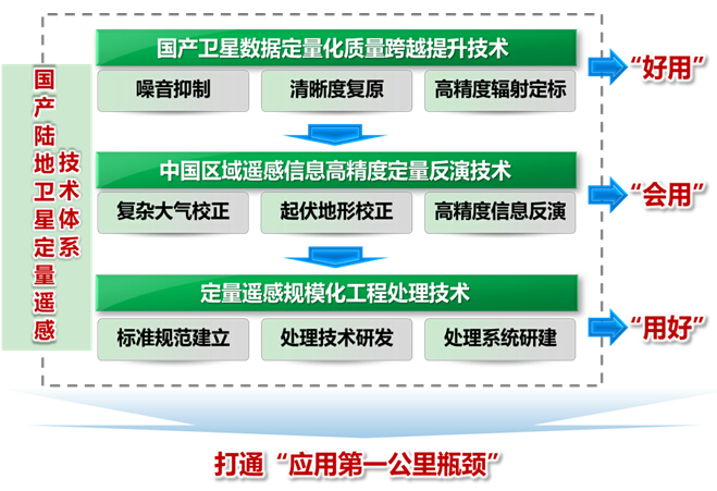 该成果由遥感地球所牵头,联合中国资源卫星应用中心、中国国土资源航空物探遥感中心、中国农业科学院农业资源与农业区划研究所、新疆维吾尔自治区卫星应用中心、环境保护部卫星环境应用中心及中科遥感科技集团有限公司,二十一世纪空间技术应用股份有限公司,浙江大学,为满足行业、区域定量遥感业务应用需求,实现国产陆地卫星的高效利用,针对国产陆地卫星定量化应用水平低的难题,历经十余年,重点攻克了国产陆地卫星数据质量提升、中国复杂多变环境下的定量遥感反演、定量遥感规模化工程处理关键技术,构建了国产陆地卫星定量遥感技术体系。