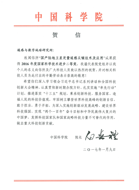 1月9日,2016年度国家科学技术奖励大会在京召开。以中科院遥感地球所为第一完成单位,顾行发研究员为第一完成人的“国产陆地卫星定量遥感关键技术及应用”成果荣获国家科技进步二等奖(社会公益类)。