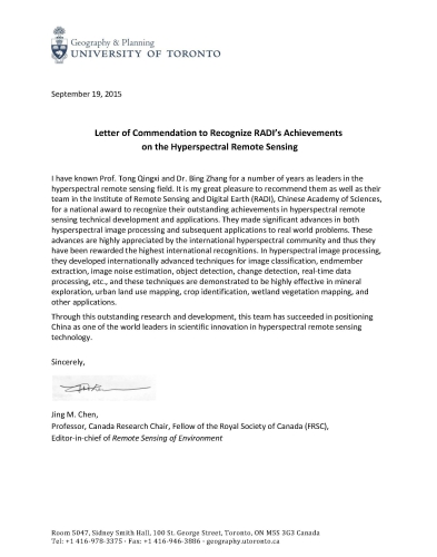Remote Sensing of Environment主编Jingming Chen教授(加拿大皇家科学院院士)称“他们在研究高光谱图像处理和多学科应用中的世界性难题方面取得重大成果”(They made significant advances in both hysperspectral image processing and subsequent applications to real world problems)。