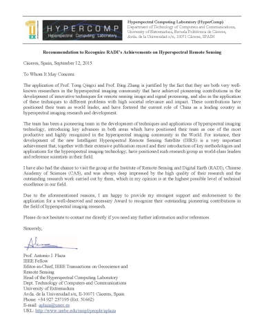 IEEE Transactions on Geoscience and Remote Sensing主编Antonio Plaza教授(IEEE Fellow)称“他们在高光谱遥感技术方法和应用方面发表了大量重要学术论文,是高光谱遥感领域国际一流研究团队和学术标杆”(Their extensive publication record and ...., have positioned such research group as world-class leaders and reference scientists in their field),“他们杰出的研究成果给我留下了深刻的印象,达到了我们这个领域的最高水平”(was always deep impressed by the high quality of their research and the outstanding research work carried out by them, which in my opinion is at the highest possible level of technical excellence in our field);