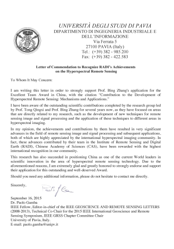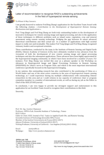 IEEE Geoscience and Remote Sensing Letters主编Paolo Gamba教授(IEEE Fellow)称“他们在高光谱遥感图像处理和应用中均取得了重要成果,在国际高光谱遥感学术界获得高度评价”(the achievements and contributions by them have resulted in very significant advances in the field of remote sensing image and signal processing and subsequent applications,both of which are highly appreciated by the international hyperspectral imaging community)。
