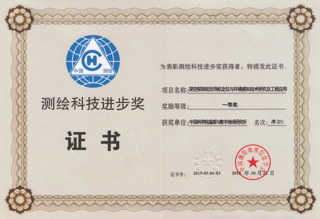 针对深空探测的重大工程需求,为深空探测中高精度制图和定位探索新的视觉导航定位与环境感知的模型、理论和方法,由我实验室行星遥感团队承担的深空探测视觉导航定位与环境感知技术研究及工程应用项目,历时五年的研究试验与工程应用,日前通过中国测绘学会奖励委员会评审,荣获2015年度测绘科技进步一等奖。
