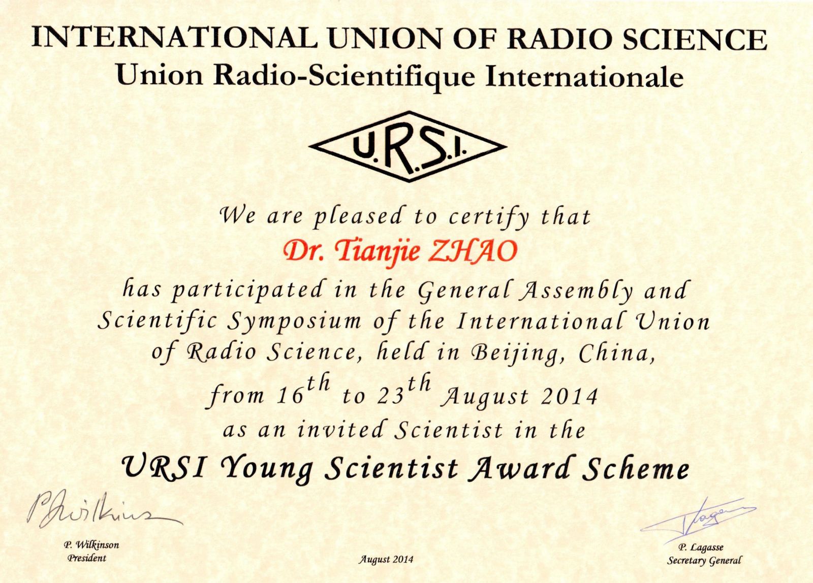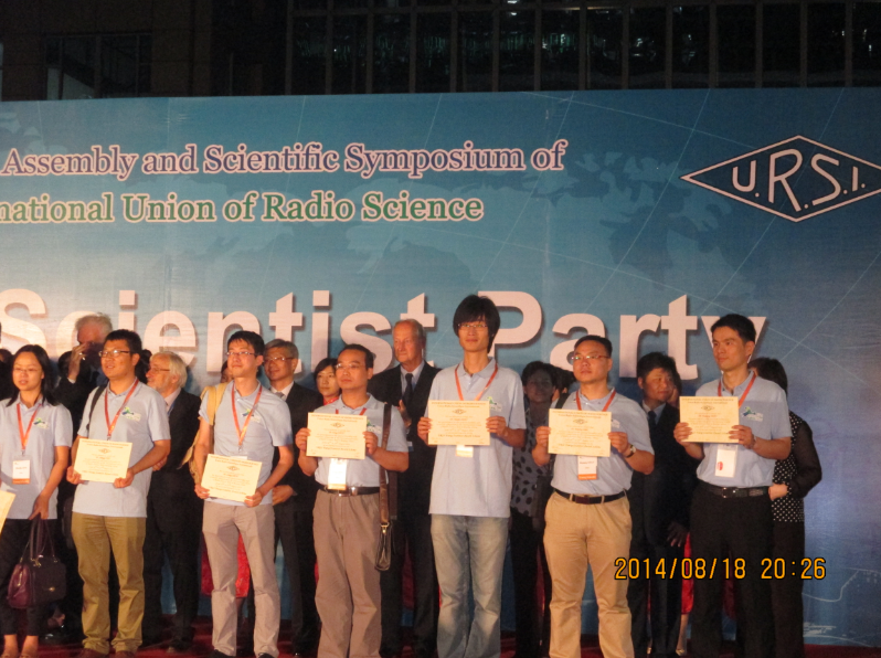 2014年8月18日晚,第三十一届国际无线电科学联盟大会(URSI GASS)青年科学家颁奖典礼在北京航空航天大学举行。国际无线电科学联盟秘书长Paul Lagasse教授宣读了青年科学家评选过程及结果,URSI主席Phil Wilkinson教授、中国电子学会秘书长徐晓兰等15位中外科学家代表分别向获得本届大会青年科学家奖的青年学者颁发了证书。遥感科学国家重点实验室赵天杰博士凭借其在土壤水分微波遥感领域的研究成果获此殊荣。
