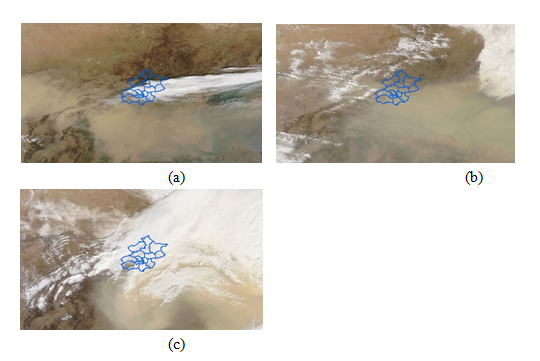图1 北京沙尘暴期间的MODIS影像(a)2005年4月28日,(b)2006年4月17日,(c)2010年3月20日