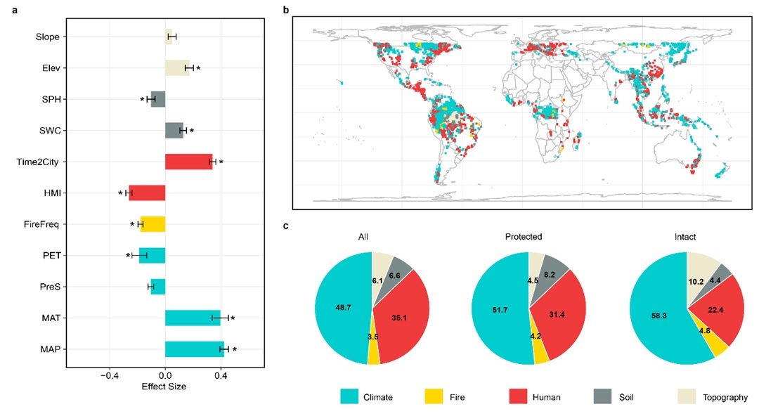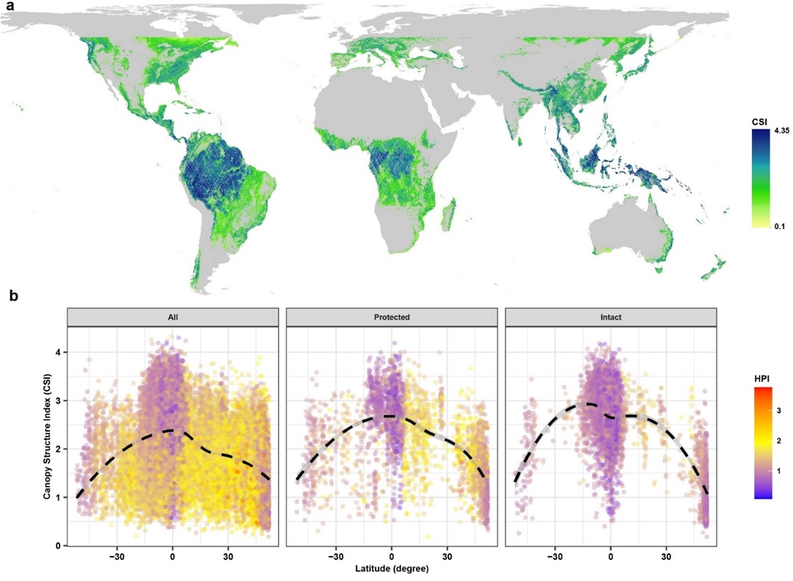森林是地球上最活跃的陆地生态系统之一,尤其是未受侵扰的原始森林景观(Intact Forest Landscape,后续简称原始林),拥有较高的完整性和动植物生物多样性。尽管如此,目前全球只有12%的原始林得到保护,更多的原始林仍面临严峻的退化风险。气候变化和人类活动被认为是影响森林的重要环境因子,但这些环境因子影响全球森林结构的普遍性以及它们将如何塑造未来森林结构仍然存在很高的不确定性。尤其是在全球范围内人类活动影响是否已显著延伸到通常被认为受人类影响不明显的保护地森林和原始林仍然未知。中科院空天信息创新研究院(空天院)遥感科学国家重点实验室碳循环研究室李旺博士、牛铮研究员和王力研究员等与丹麦奥胡斯大学、华东师范大学、可持续发展大数据国际研究中心的专家开展了全球森林多维结构遥感监测及其可持续发展与保护方面的研究。