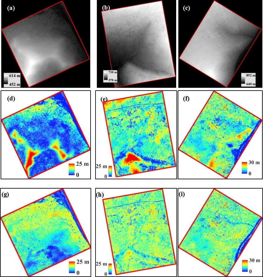 典型地形条件下森林高度提取的效果。(a)-(c)为光学多角度立体观测数据获取的数字表面模型(DSM) ;(d)-(f)为光学多角度立体观测数据通过林窗插值提取的森林高度,由于浓密林区林窗较少,导致树高被严重低估,或者地形特征去除不彻底; (g)-(i)为利用AGAR提取的森林高度。(a)区域覆盖了山脊,(b)区域覆盖了山谷;(c)区域覆盖了从山脚到山顶的斜坡。