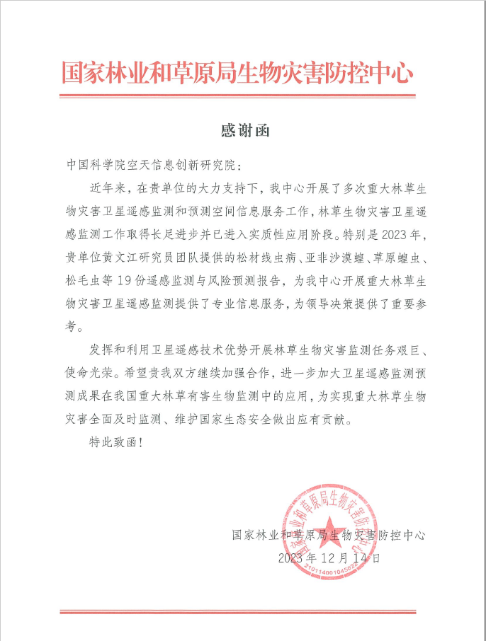 近日,国家林业和草原局生物灾害防控中心(以下简称:中心)给中国科学院空天信息创新研究院发来感谢函,中心在感谢函中对实验室黄文江研究员带领的植被遥感机理与病虫害应用团队表达感谢。中心表示黄文江研究员团队近年来支撑中心开展了多次重大林草生物灾害卫星遥感监测和预测空间信息服务工作,使得林草生物灾害卫星遥感监测工作取得长足进步并进入实质性应用阶段。特别是2023年,黄文江研究员团队提供的松材线虫病、亚非沙漠蝗、草原蝗虫、松毛虫等19份遥感监测与风险预测报告,为中心开展重大林草生物灾害卫星遥感监测提供了专业信息服务,为领导决策提供了重要参考。