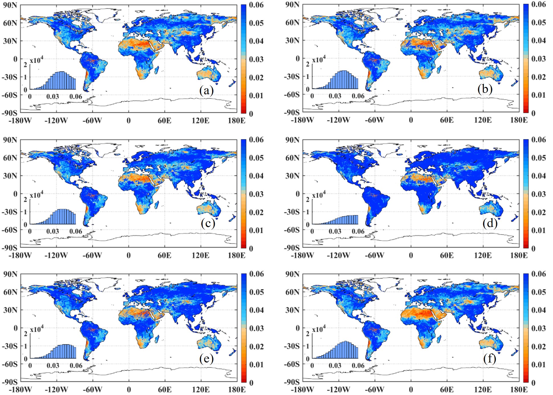 图1.验证阶段(2018-2019年)基于ERA5利用不同方法填补SMAP土壤水分数据相对于原始SMAP数据的RMSE全球分布图:(a)一元一次线性回归,(b)一元二次线性回归,(c)线性重缩,(d)最大最小校正,(e) CDF匹配,(f) RF方法。