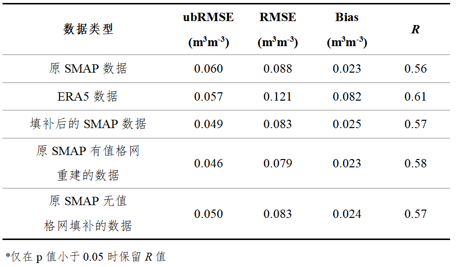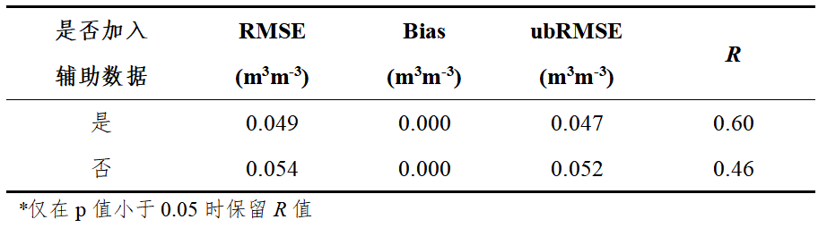 表1.基于RF方法在验证阶段对比加入辅助数据前后的填补数据与原始SMAP数据的精度表