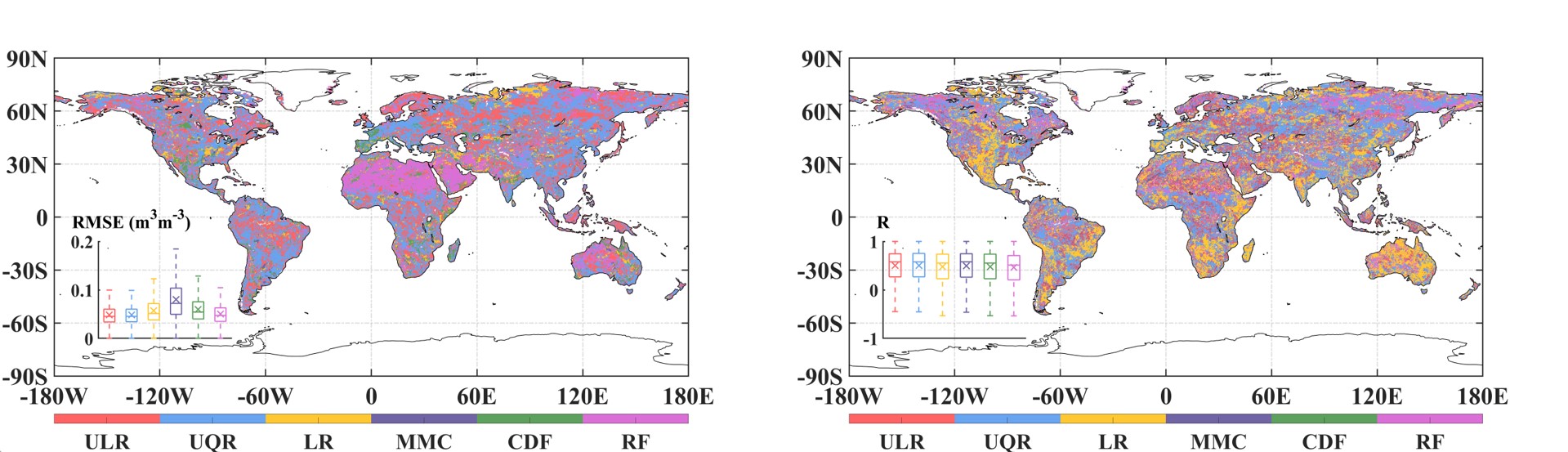 图2. 验证阶段(2018-2019年)基于ERA5数据利用不同方法填补SMAP土壤水分数据相对于原始SMAP数据的最低RMSE(左图)和最高R(右图)的全球分布图。ULR、UQR、LR、MMC、CDF和RF分别表示一元一次线性回归、一元二次线性回归、线性重缩、最大最小校正、CDF匹配和RF。