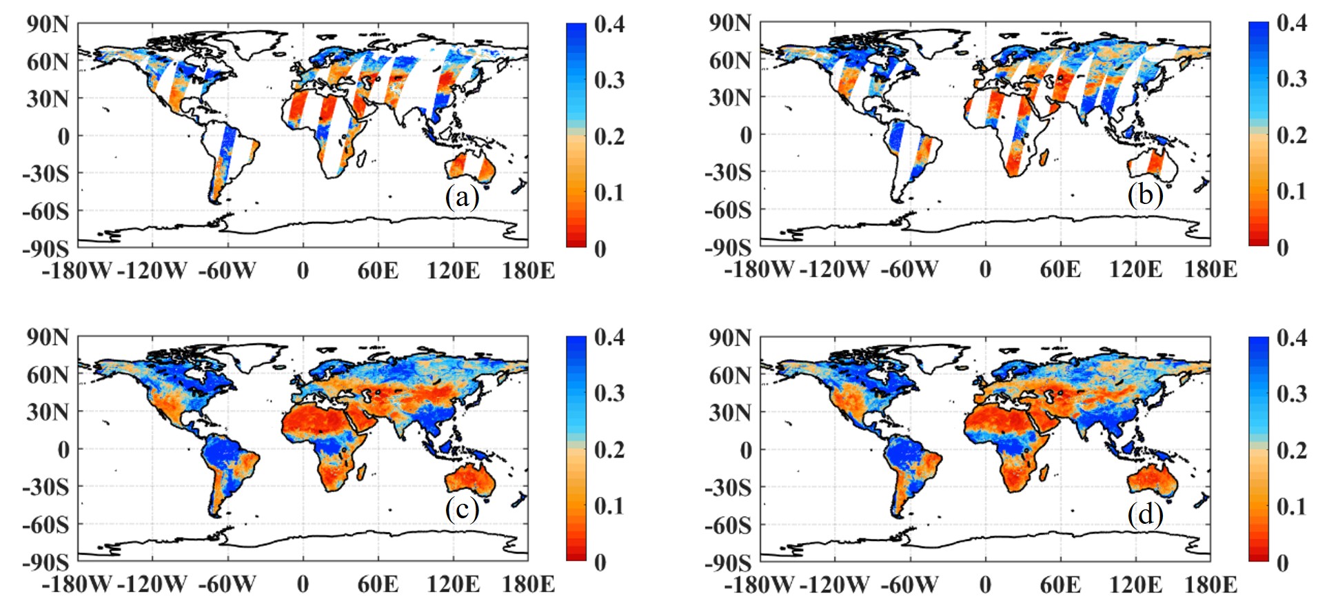 图3. 基于表现最佳的RF方法分别填补2018年6月1日(第一列)和2018年9月1日(第二列)两天的缺值前后SMAP数据(m3m-3)在全球的分布情况:(a)和(b)为填补前结果,(c)和(d)为填补后结果。