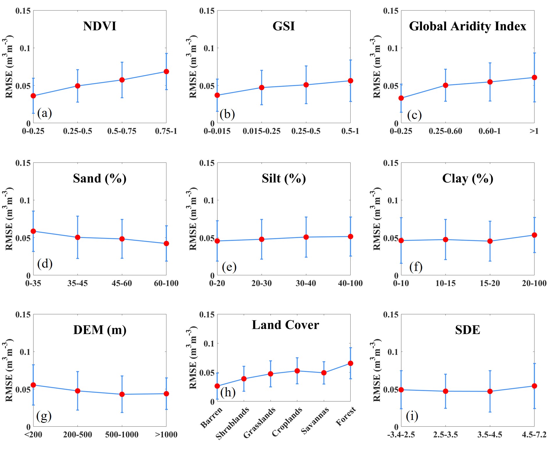 图4. 加入辅助数据的RF方法填补精度受环境因素的影响结果:(a) NDVI,(b) 地表类型异质性,(c) 气候类型,(d) 砂土,(e) 壤土,(f) 粘土,(g) DEM,(h) 地表类型,(i) 高程异质性。红色圆形代表RMSE的平均值,误差棒代表RMSE值的标准偏差。