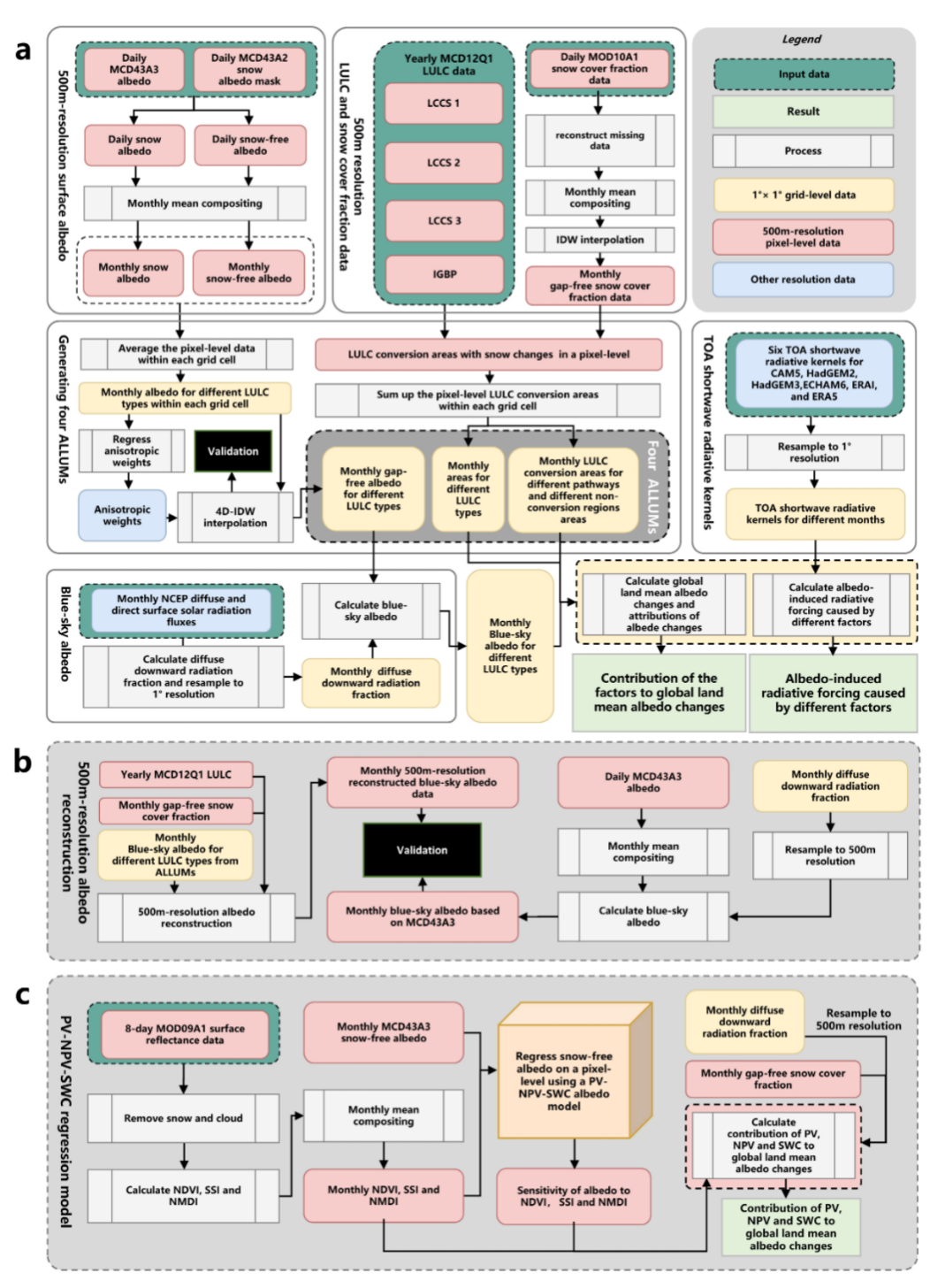 研究整合了500米分辨率的MODIS反照率、积雪覆盖和LULC产品,基于四种不同的LULC分类产品(LCCS 1-3和IGBP)构建了四个无缝的全球月度反照率和LULC查找表数据集(ALLUMs,图1),提供了2001-2020年全球范围每个1°×1°的网格内每种LULC类型的月度反照率变化,以及月度的LULC和冰雪变化信息。该数据集用于解析冰雪变化、LULC变化及未发生LULC变化区域的陆表变化对全球陆表反照率的贡献。