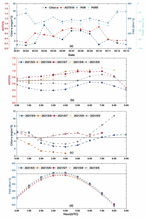 图2 (a) 2021年5月1日至13日沙尘事件后南黄海中部AOT510、Chlor-a、PAR和PARF值的日平均变化。(b) AOT510、(c)Chlor-a和(d) PAR在5月5日至9日UTC时间0点至9点的每小时平均变化