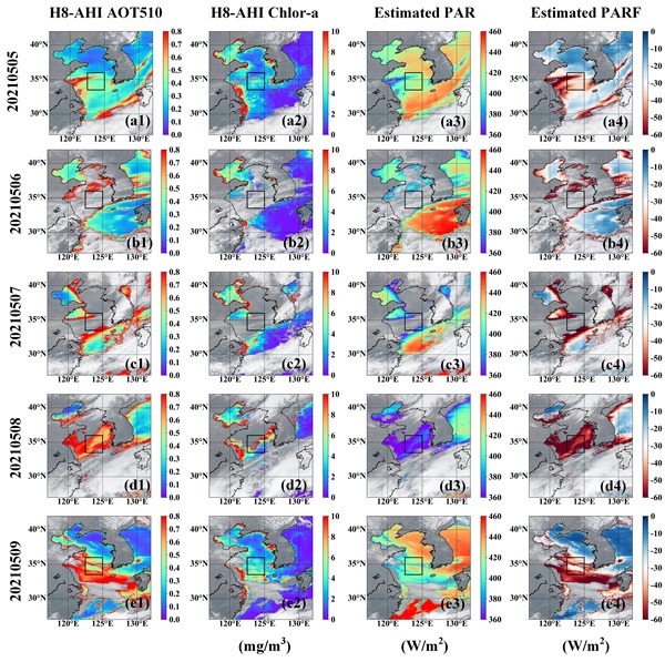 本研究还探究了各种类型的气溶胶(如灰尘、海盐、黑碳、硫酸盐和有机物)和Chlor-a对光合有效辐射(PAR)计算的影响,并基于大气-海洋耦合的辐射传输模式开发了一个能反演晴空条件下PAR的算法。进一步,通过计算PAR的辐射强迫(PARF)定量评估了气溶胶和Chlor-a对PAR的影响。图2和图3分别为2021年5月沙尘事件发生前后南黄海Chlor-a、AOT510、PAR和PARF值的详细时间变化图(逐日和逐小时)和空间分布图。结果表明,沙尘气溶胶浓度增加期间,AOT为0.82,晴空条件下平均日间PARF为−42.469 W/m2。沙尘事件一到两天之后,Chlor-a平均水平显著升高。这些发现表明,AOT和PAR会立即受到沙尘的影响,但海洋生态系统需要一段时间才能做出响应(即Chlor-a的延迟响应)。这种延迟响应可能是因为沙尘带来的营养物质需要一段时间才能被海洋生物吸收和利用,从而影响叶绿素a的浓度。