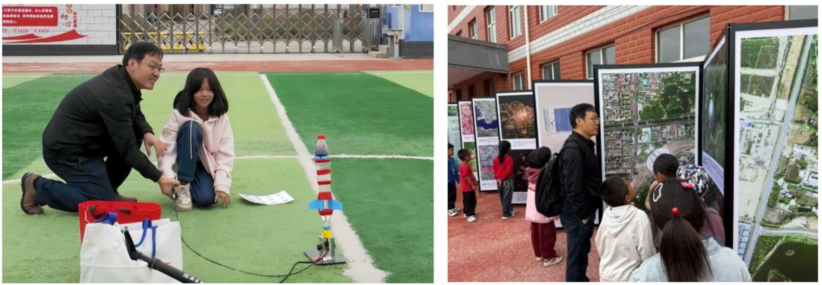 二室党总支与办公室党支部还共同策划了卫星遥感影像展和模拟火箭发射小实验等互动环节。影像展以独特视角呈现了中华大地的壮美山河、自然变迁和社会经济发展;模拟火箭发射实验则让学生亲身体验航天科技,激发他们对科学的兴趣。