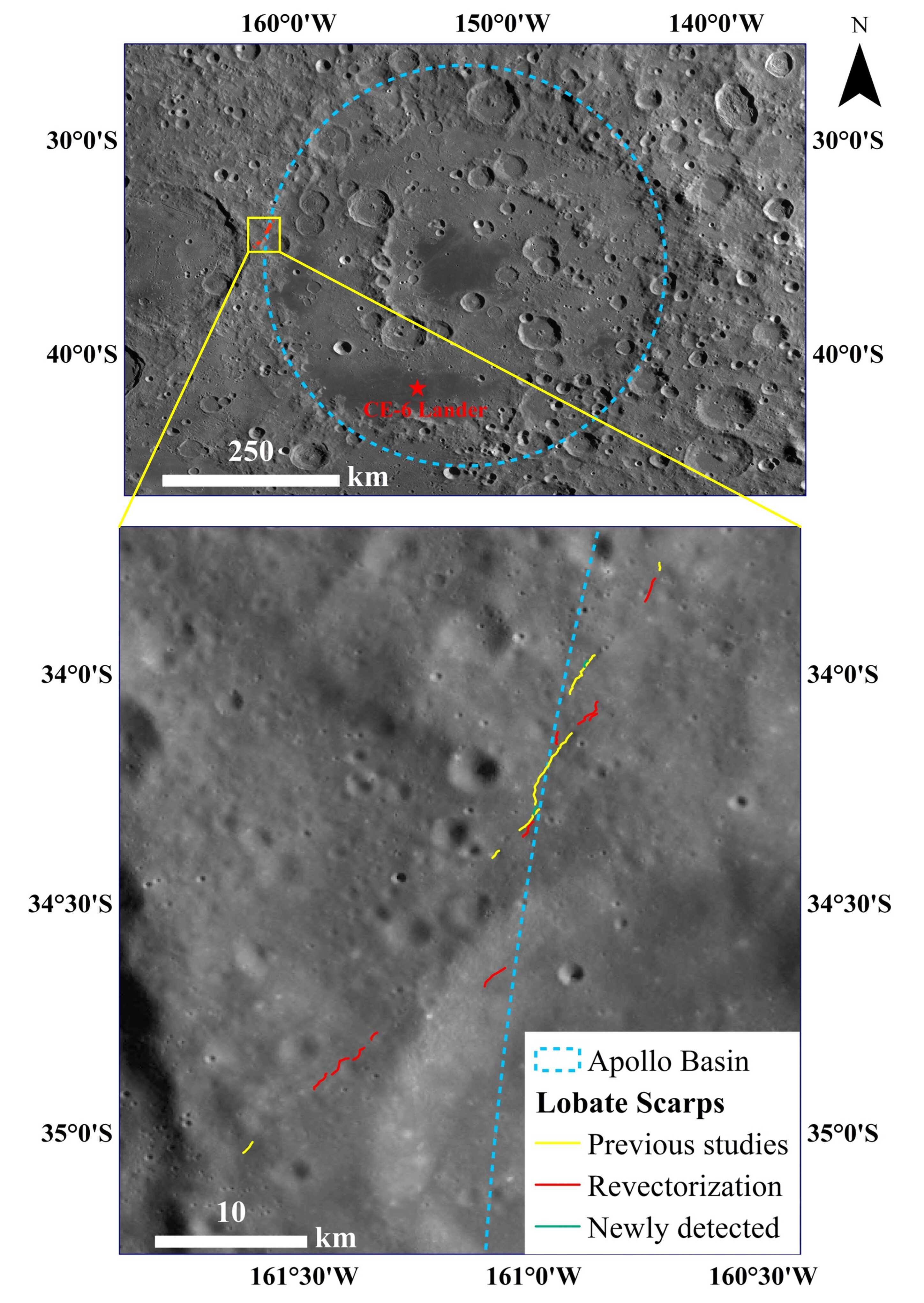 Spatial distribution of lobate scarps at the northwest of the Chang'e-6 landing area shown on the LROC WAC image. (Image by AIR)