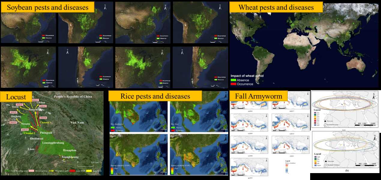 The team led by Dr. Huang Wenjiang at the Aerospace Information Research Institute, Chinese Academy of Sciences, has been addressing the significant global need for monitoring, forecasting, and controlling vegetation diseases and pests. They have conducted research on monitoring and forecasting methods for vegetation diseases and pests based on high temporal and spatial resolution remote sensing data. The team has developed the Vegetation Pest and Disease Remote Sensing Monitoring and Forecasting System. Moreover, they have produced specialized maps and scientific reports in both Chinese and English for major diseases and pests affecting key crops such as wheat, rice, corn, and soybeans, covering 38 countries worldwide. Their work has enhanced the efficiency of disease and pest monitoring, improved the accuracy of monitoring and forecasting, and increased the continuity and effectiveness of their products and services. Through deep collaboration with government departments and international organizations, the team has facilitated the global implementation of their system and products in key countries and regions. Their achievements have been cited and adopted over 200 times by international organizations such as the Food and Agriculture Organization of the United Nations (FAO), the Global Biodiversity Information Facility (GBIF), and CAB International (CABI). Additionally, government departments and institutions such as the Italian National Research Council, the UK's Newton Fund, Agriculture and Agri-Food Canada, the Ethiopian Space Science Society, the Chinese Disaster Prevention Working Group in Pakistan, and Pakistan's PMAS-Arid Agriculture University have utilized these results. The team has promoted the application of remote sensing monitoring and forecasting technology for diseases and pests in countries including Kenya, Somalia, Yemen, Ethiopia, Pakistan, India, and Nepal, supporting the scientific control of over 20 million hectares (approximately 300 million mu). This has effectively supported the scientific control of diseases and pests, ensuring food security and regional stability.