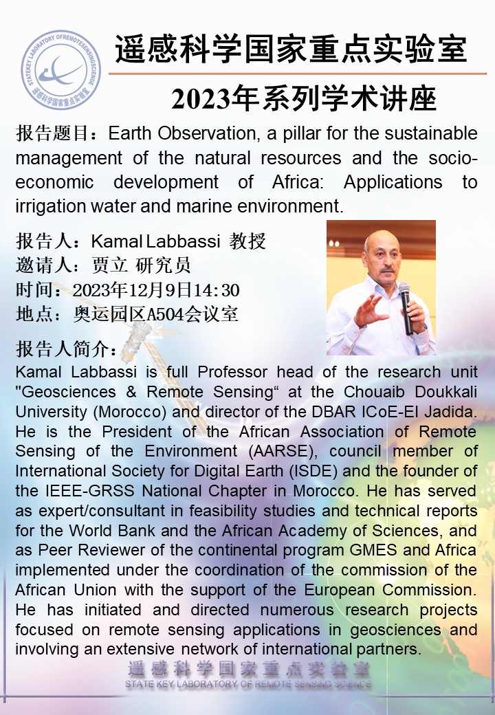 报告题目:Earth Observation, a pillar for the sustainable management of the natural resources and the socio-economic development of Africa: Applications to irrigation water and marine environment